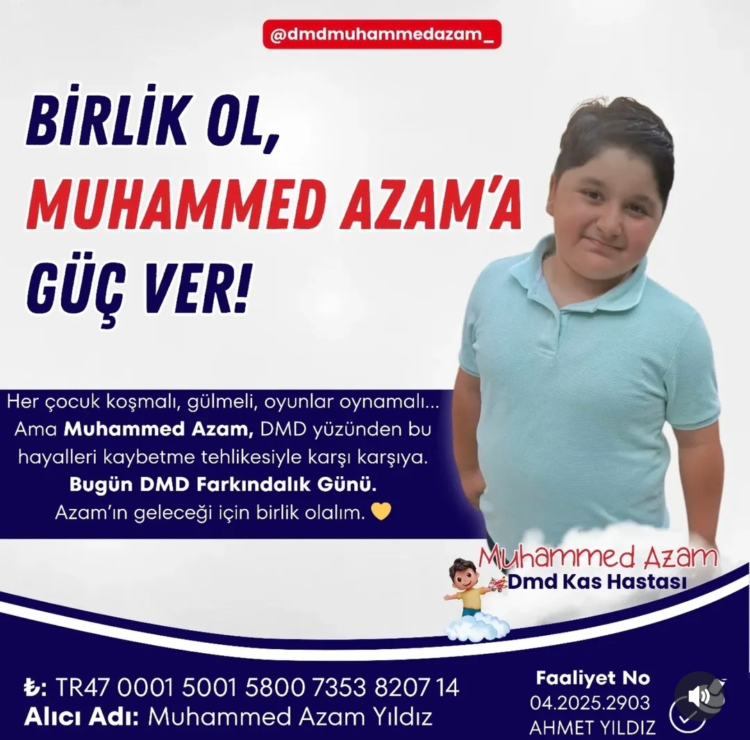 Muhammed Azam Yıldız, ölümcül kas hastalığıyla mücadele eden küçük bir çocuk… Günden güne eriyen, desteksiz yürüyemeyen ve yaşam kalitesi her geçen gün daha da düşen Muhammed, tedavi olabilmek için acil desteğe ihtiyaç duyuyor. Ailesi ve yakın çevresi, onun durumunun kritik bir aşamaya geldiğini belirtiyor. Doktorların yaptığı değerlendirmelere göre, tedavi sürecine bir an önce başlanması gerekiyor. Aksi halde hastalığın ilerlemesi geri döndürülemez noktalara ulaşabilir. Bu nedenle son aylara girildiği düşünülerek toplumsal destek çağrısı yapılıyor.